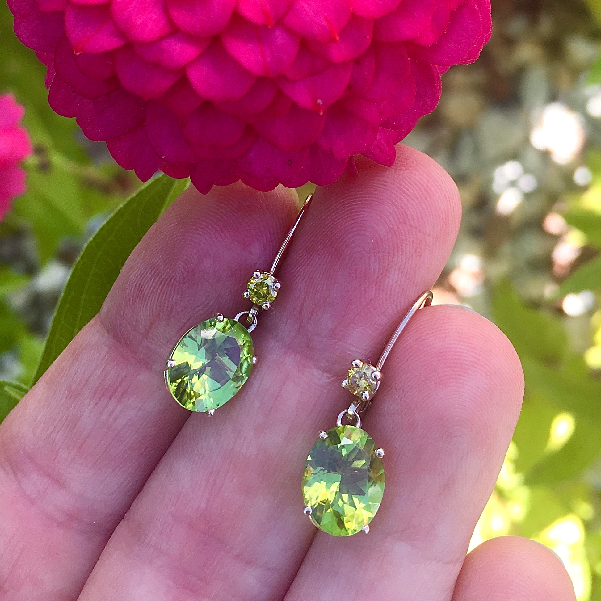 4.89 carat, matched pair of oval peridot are accented by a matched pair of .25 carats of yellow diamond in 14k yellow gold lever back dangle earrings.