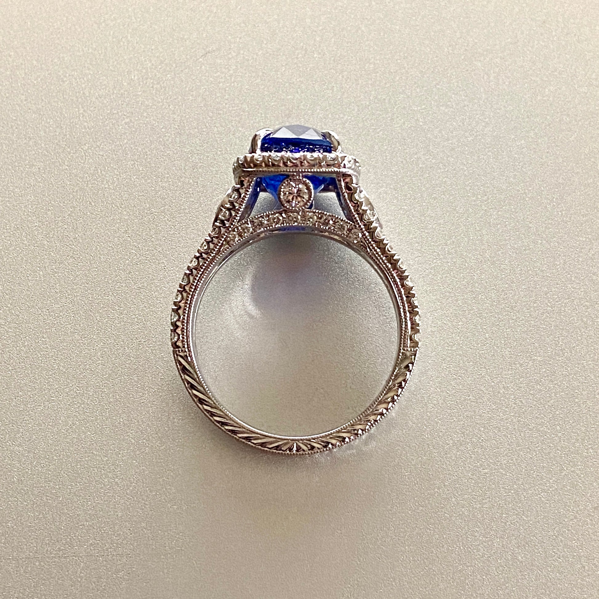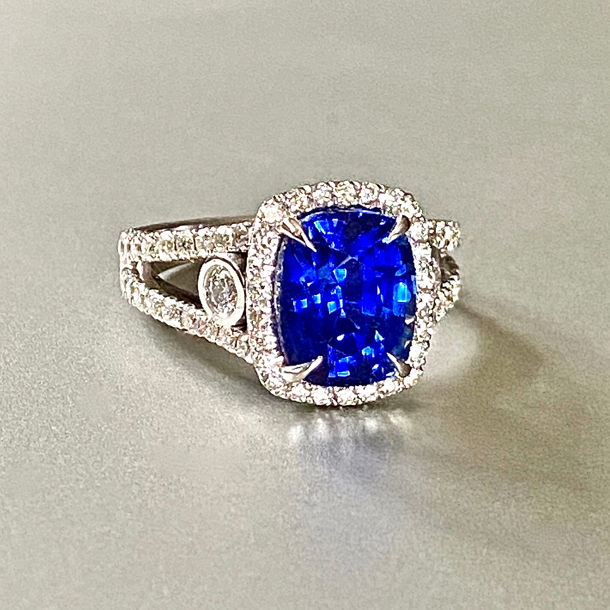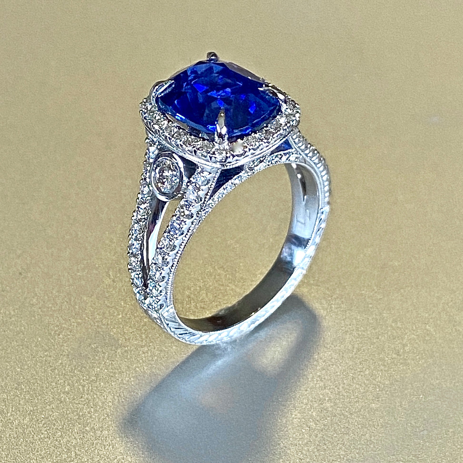 Exceptional 5.25 ct. cushion-cut Ceylon Sapphire is prong-set and framed by a halo of pave-set diamonds, 1 ct. total weight, including the split band design and bezel-set side accents in a white gold ring.