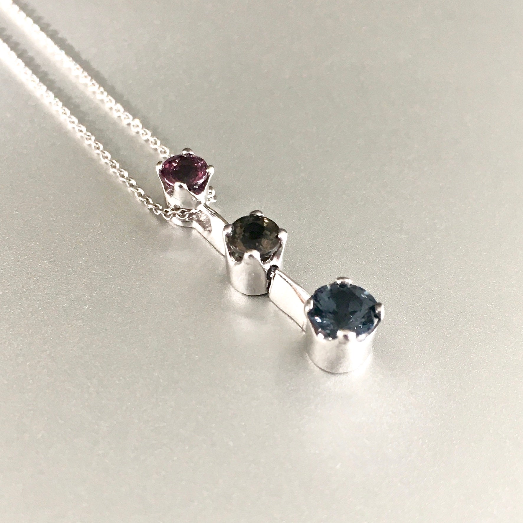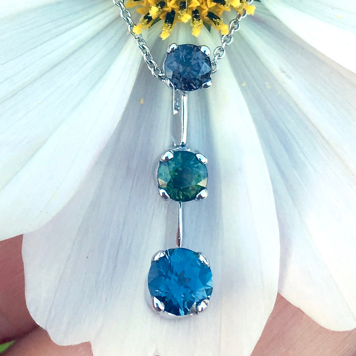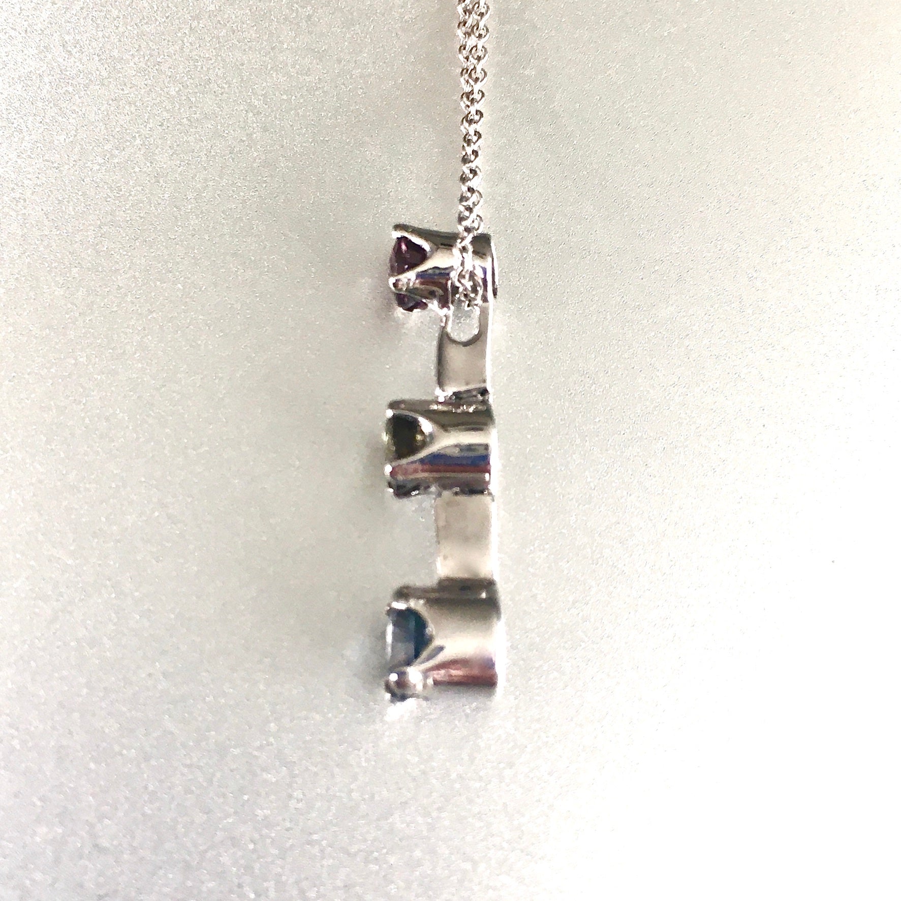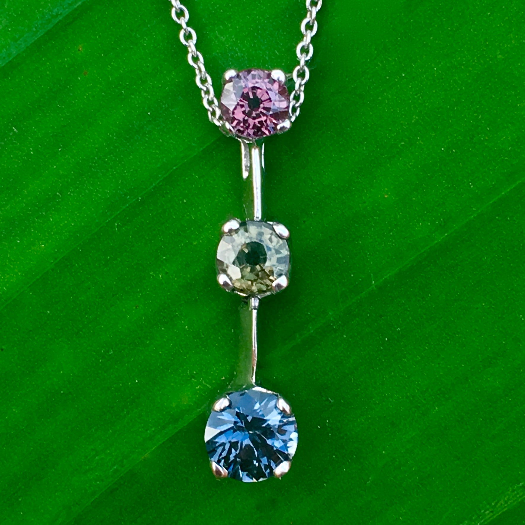 Three African color-change sapphires: purple, green and blue weigh 1.25 total and are prong-set in a 14kt white gold segmented pendant. Pendant measures 7/8” inches in length and comes on a 16” 14kt white gold chain.