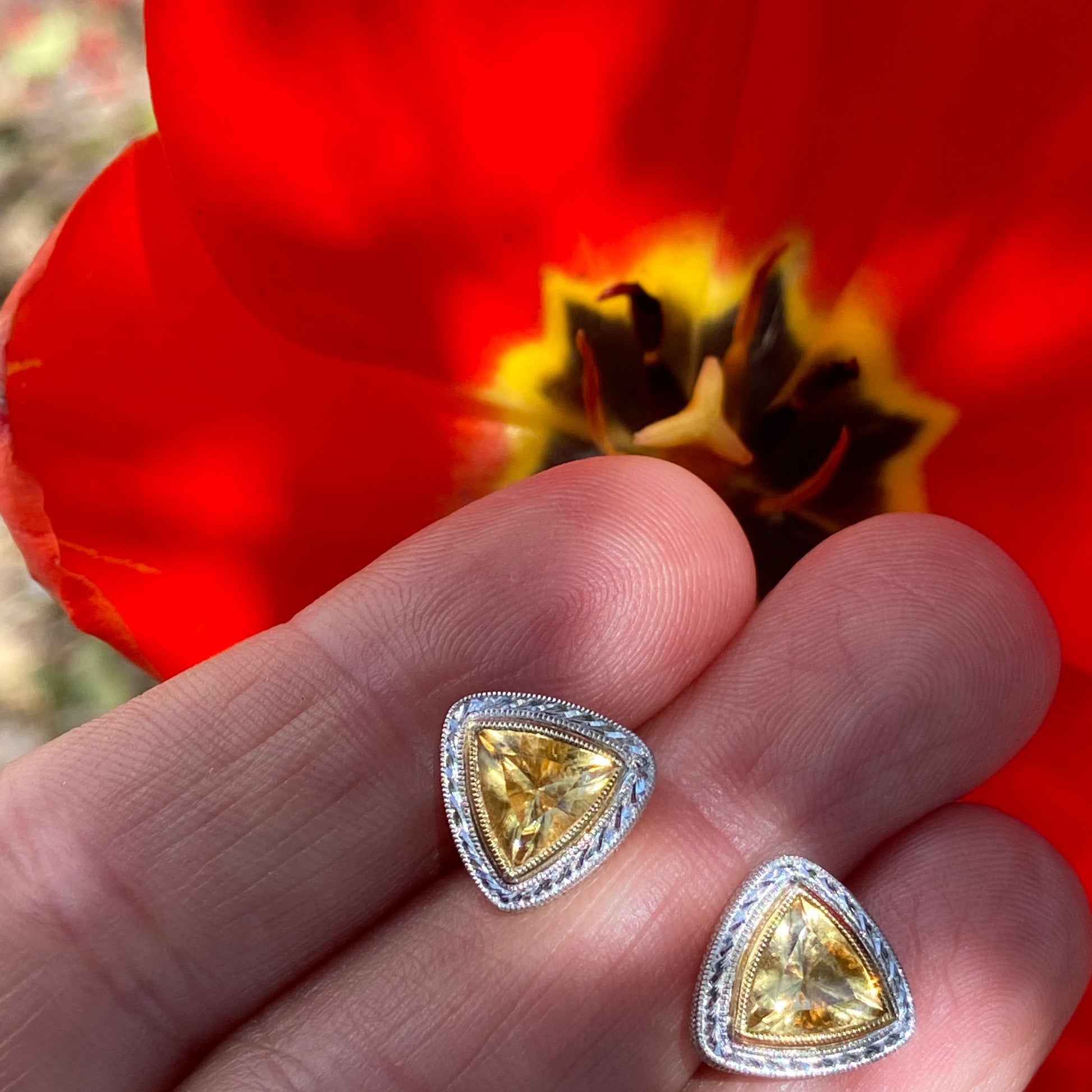 Matched pair of trillion cut yellow zircons are bezel-set in 18kt white and yellow gold milgrain-accented, hand-engraved stud with post earrings.